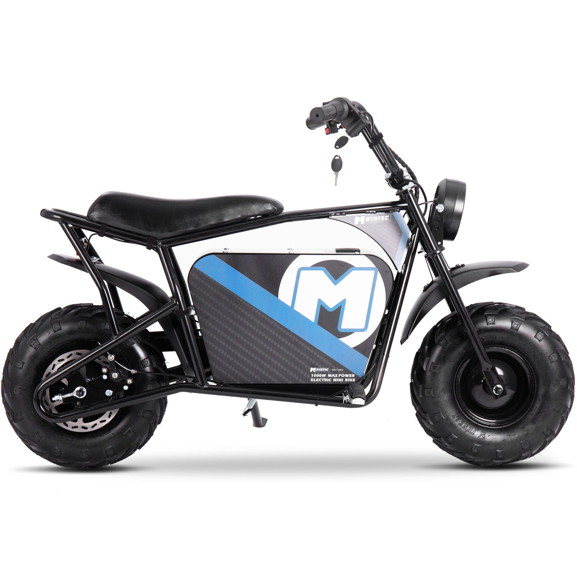 Introducing the 48v 1000w Electirc Mini Bike! Just like the ones your parents used to drive, only safer and easier to use. Powered by a brushless 1000 watt electric motor, rugged chain drive and half twist throttle for easy operation. Large front headlight, key start and half twist throttle for safetly. With it's rugged steel frame and huge knobby tires, this mini bike is built tough to handle the roughest of terrain.