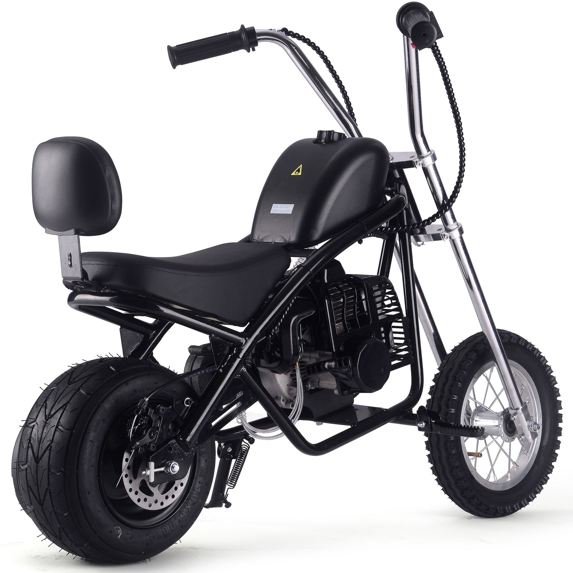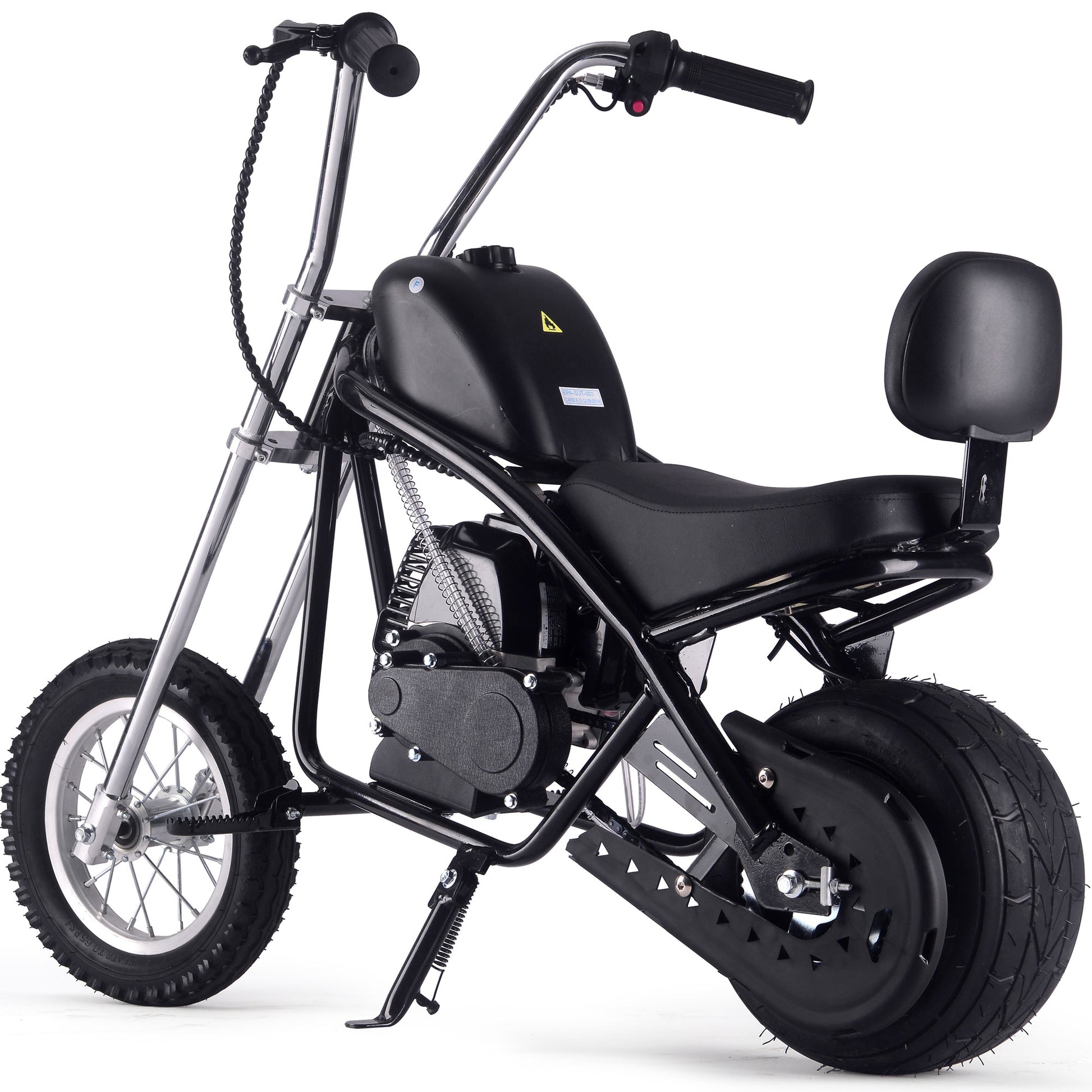 The 49cc Gas Mini Chopper V2 is the ultimate kid ride! Great for driveway and parking lot fun, cruise around cones and speed through trails with ease. Comes standard with rear disk brakes and large 12 inch front and 9 inch rear pneumatic street tires.