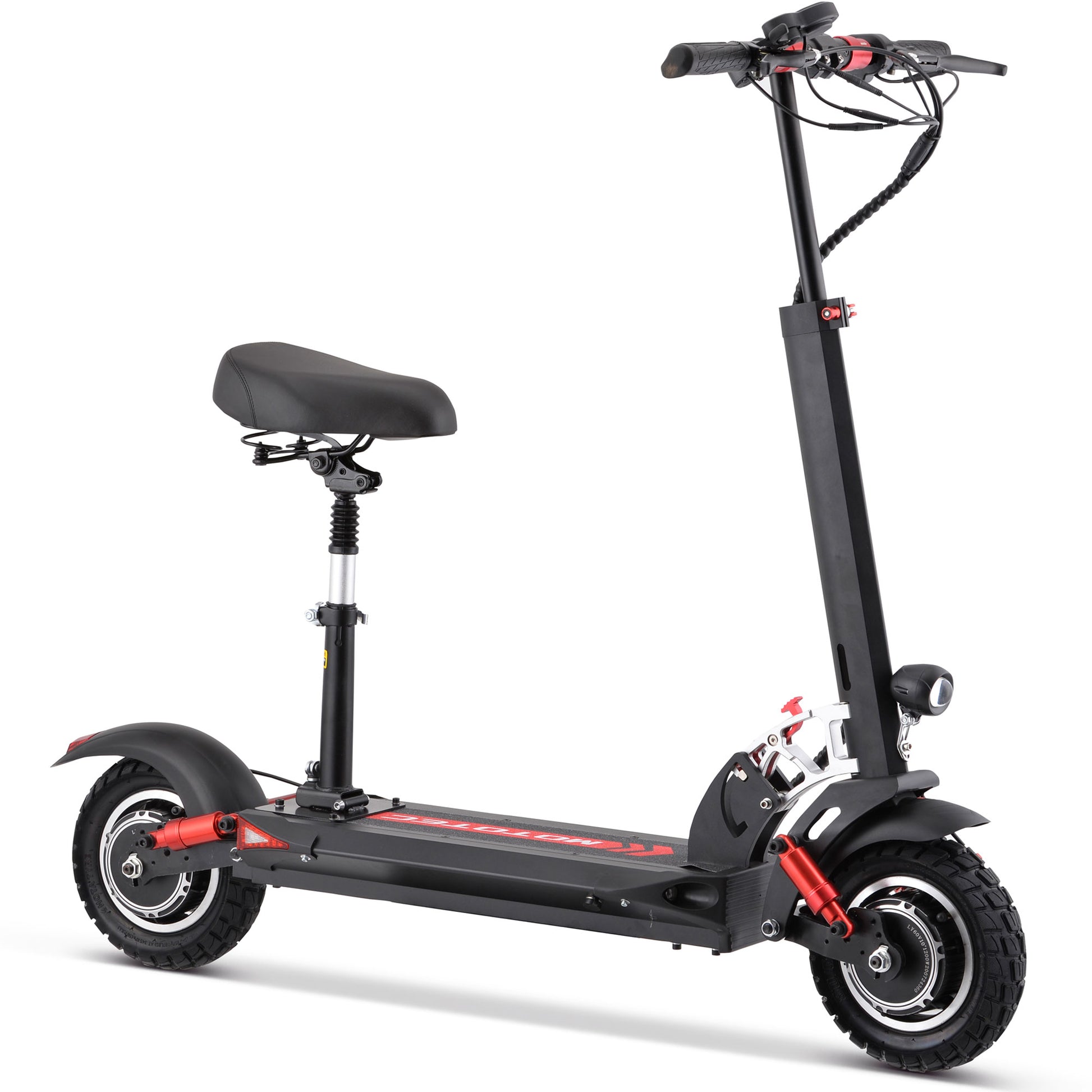 Introducing the new Thor 60v 2400w Lithium Electric Scooter with Dual Motors! Comes standard with adjustable handlebars, dual front & rear suspension, foldable frame, front & rear disc brakes, LCD panel with speedometer, odometer, cruise control, usb charging socket and 9 adjustable speeds. Dual hub motors allow you to tackle any terrain, this is our most powerful scooter and it does not disappoint!